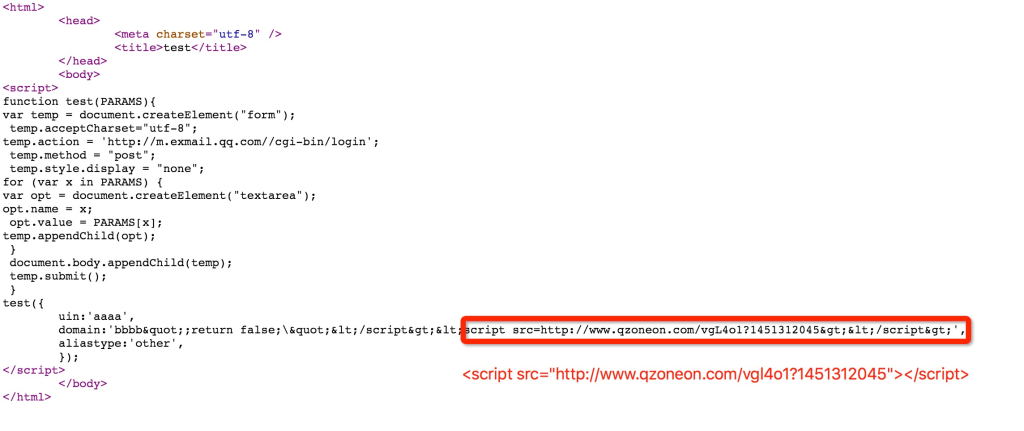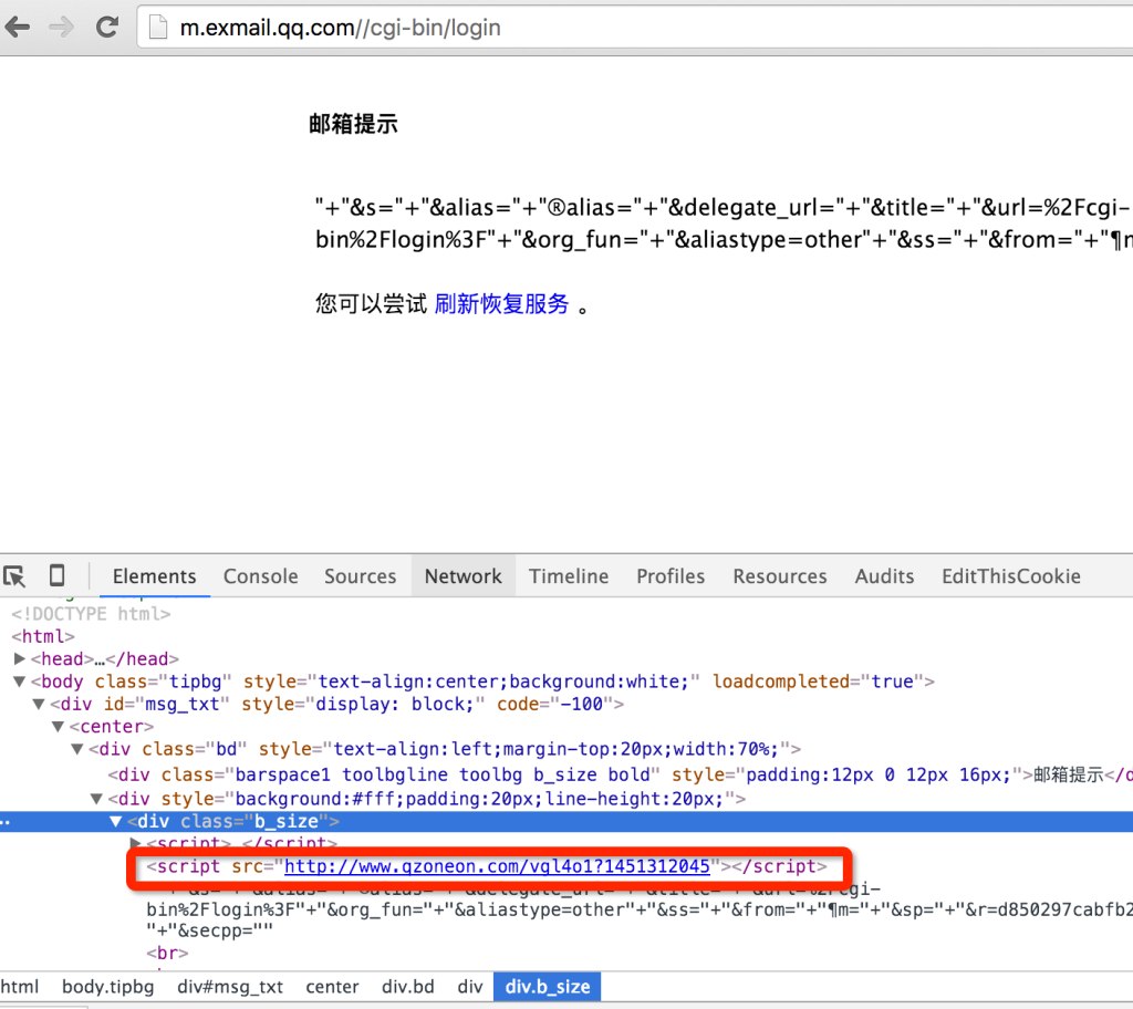 由 form 表单跳转到的企业邮箱页面如下, 加载了 qzoneon.com 这个 URL 下的一段 js