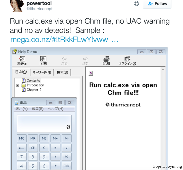 14年的时候@ithurricanept 在twitter上发了一个demo,通过CHM运行计算器: