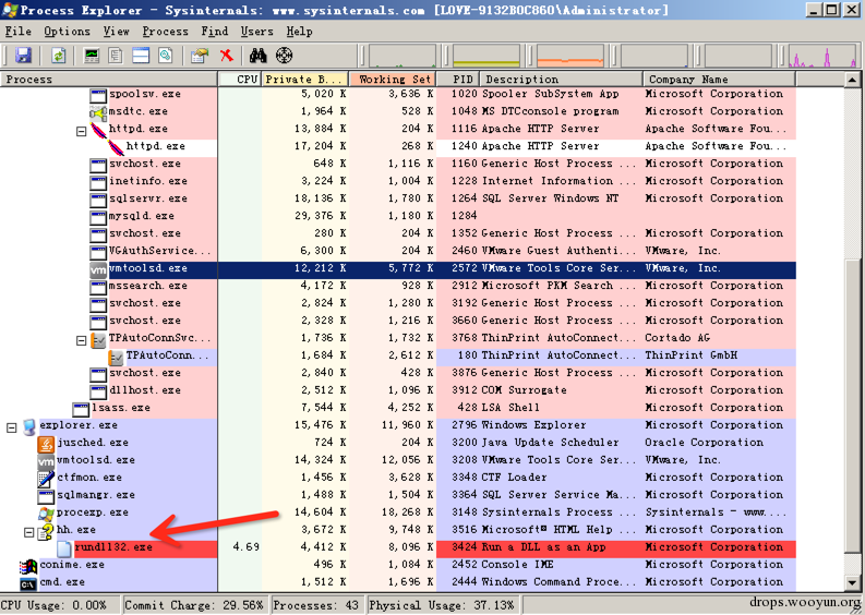 目前我还没查到什么防御的姿势,知道的小伙伴可以分享一下。最好就是提高个人安全意识,对于这类文件,多注意一下,尽量别乱点,如果非要点,可以放到虚拟机里面。使用procexp.exe可以看到存在后门的chm文件会开启新的进程: