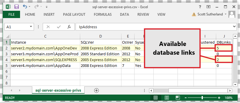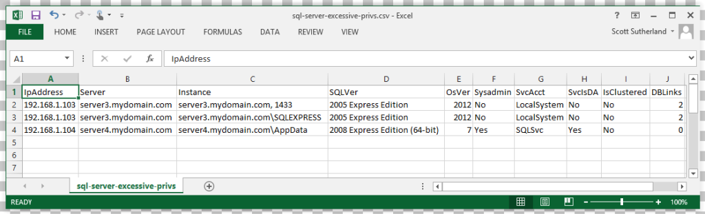 PS C:\Get-SQLServerAccess -ShowSum | export-csv c:\temp\sql-server-excessive-privs.csv