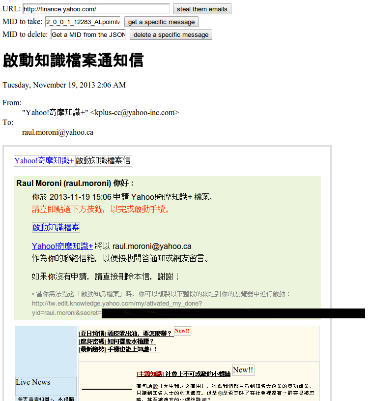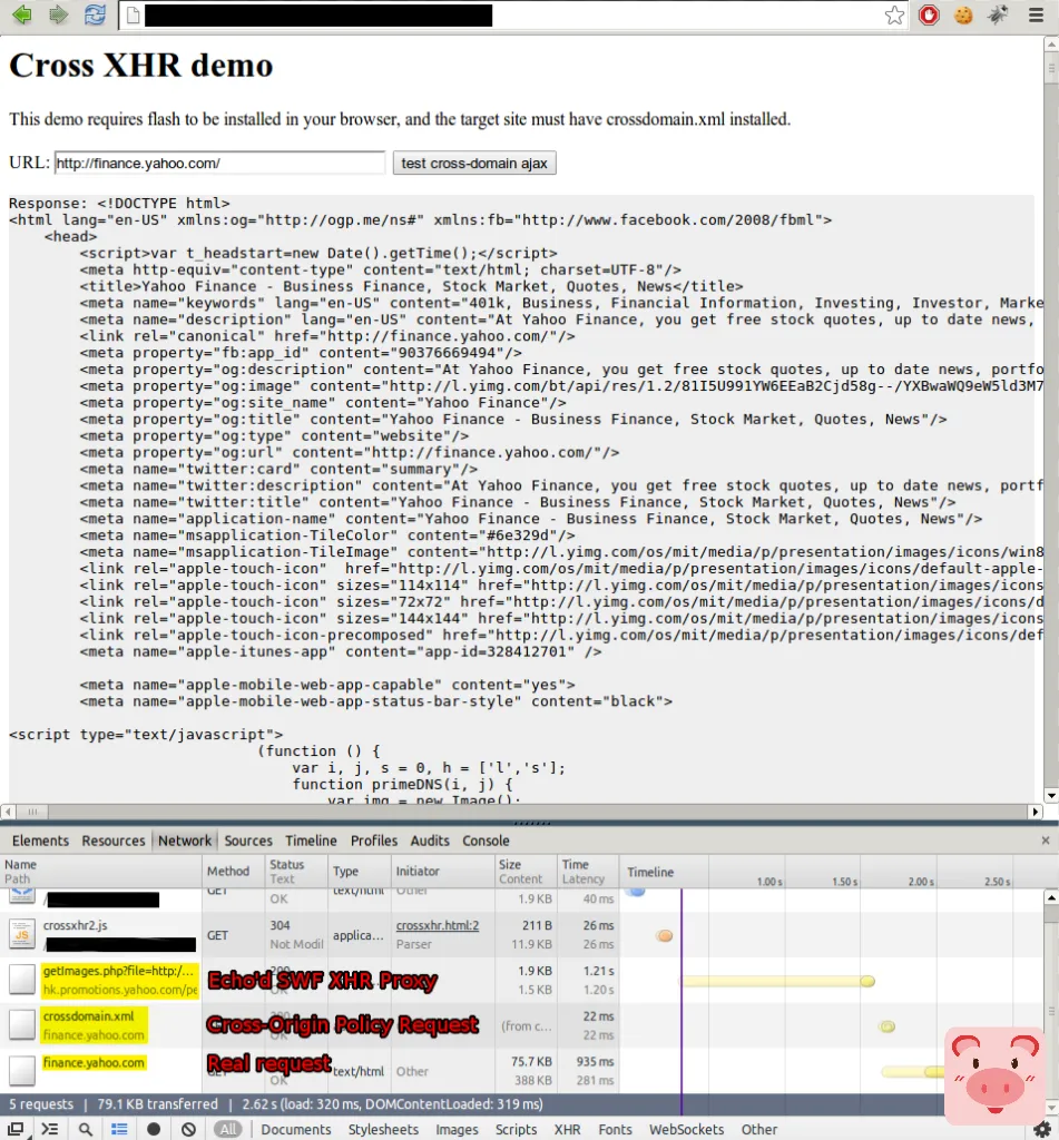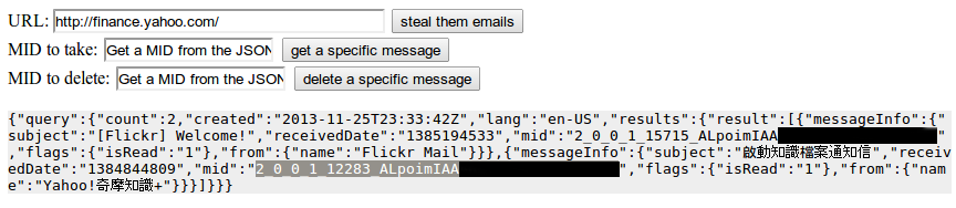 现在一切都已经很明了了。我们可以借助我们构造的swf文件来和ca-mg5.mail.yahoo.com 进行通讯。使用工具SWF<->JS XHR proxy,让我们尝试着来搞点邮件吧!我们先尝试通过这个swf里的JavaScript来发送一些跨域的请求: