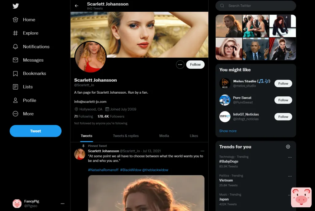 我们先找到twitter的地址(我们发现寡姐并没有twitter认证的账户,因此我们只能从粉丝账户里寻找一些信息了)