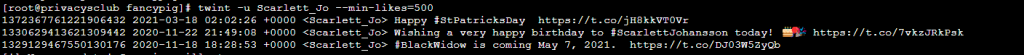 twint -u BestfScarlett --min-likes=500