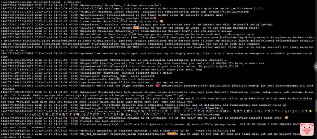 我们可以通过下面的命令来检测寡姐(Scarlett Johansson)的手机号、邮箱等资料是否曾泄露于她之前的推文中