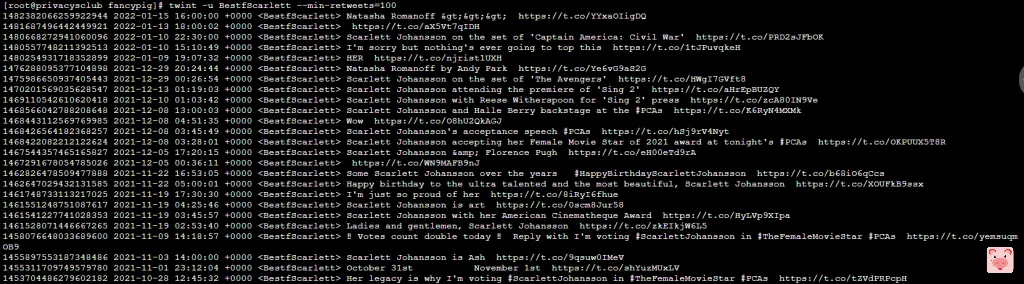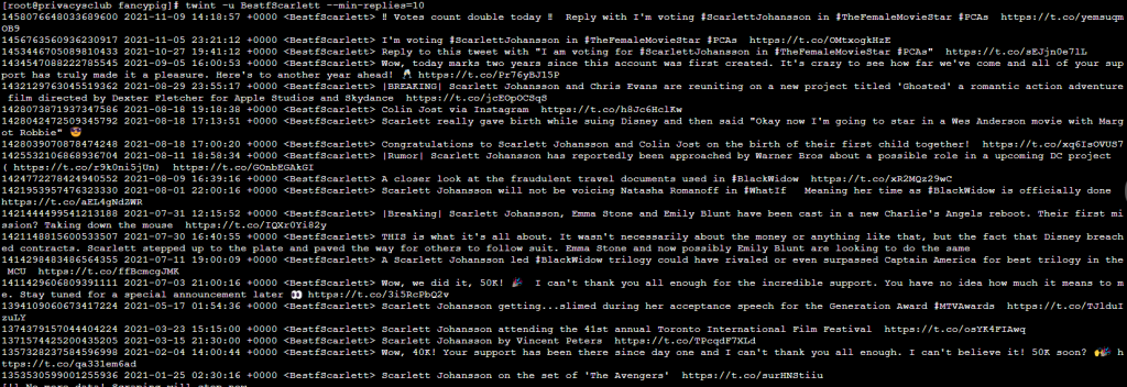 twint -u BestfScarlett --following --user-full -o Scarlett_latest_post.json --json