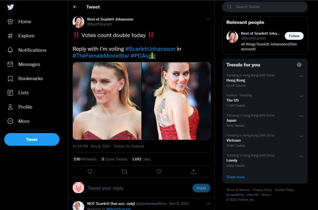 我这里下搜索twitter整个社交平台下,关于 寡姐(Scarlett Johansson)的资料