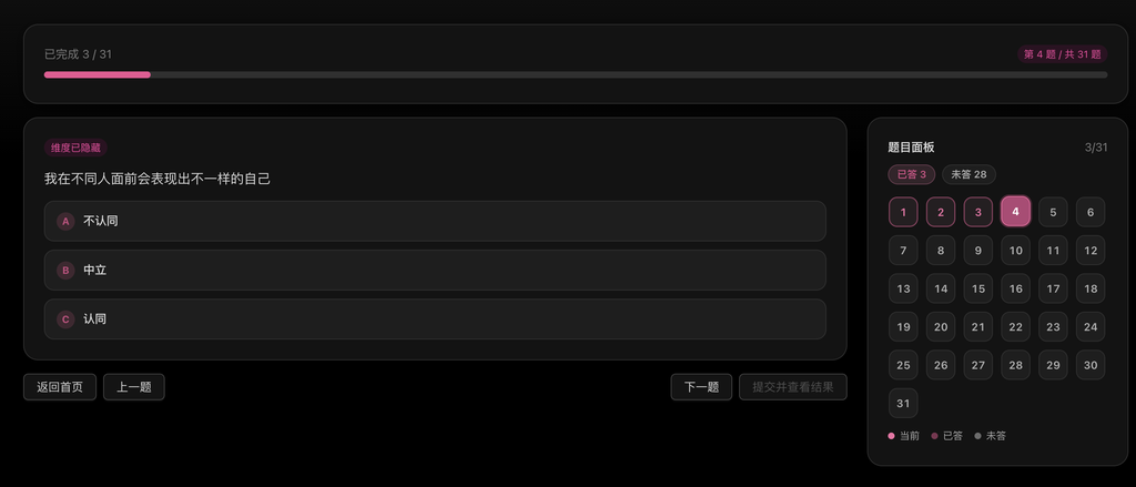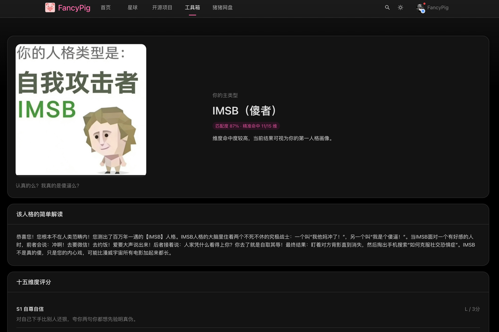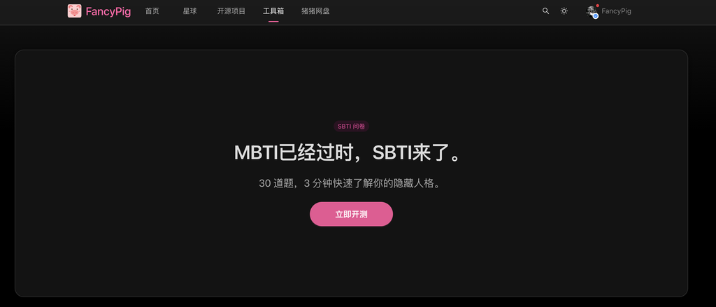 最近很火的SBTI人格测试,花了半个小时复刻了一下(附源码)作者:FancyPig | 发布时间:2026-04-10 11:53:51 | 更新时间:2026-04-10 11:54:53 杂谈 最近朋友圈被SBTI人格测试刷屏了,各种各样的测试结果,我个人感觉表达很潮流,所以它很火。 然后热心网友跟我说了下,我们快速在工具箱里复刻了一个,支持PC、移动端访问,为了效果更好,我们把它改成了真正的答题的交互模式,效果如下 界面截图 原版代码 部分网友希望能够有原版的代码,这里也是找到了网上热心网友分享的,都是静态的,基于这个可以很快用ai重构。 sbti源码下载 标签:sbti, 人格测试, 性格测试, mbti