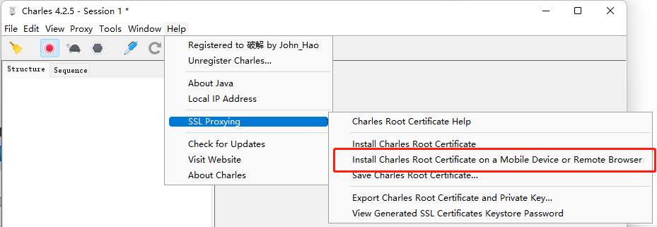选择Help>SSL Proxying>Install Charles Root Certificate on a Mobile Device or Remote Browser