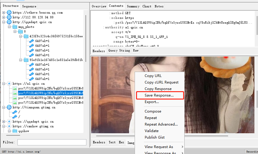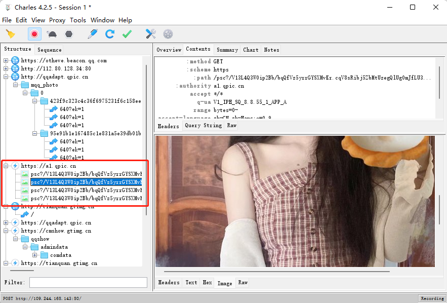 在Charles里可以看到超清的小姐姐的图片了(这里的图片在QQ空间及空间相册里是找不到的)
