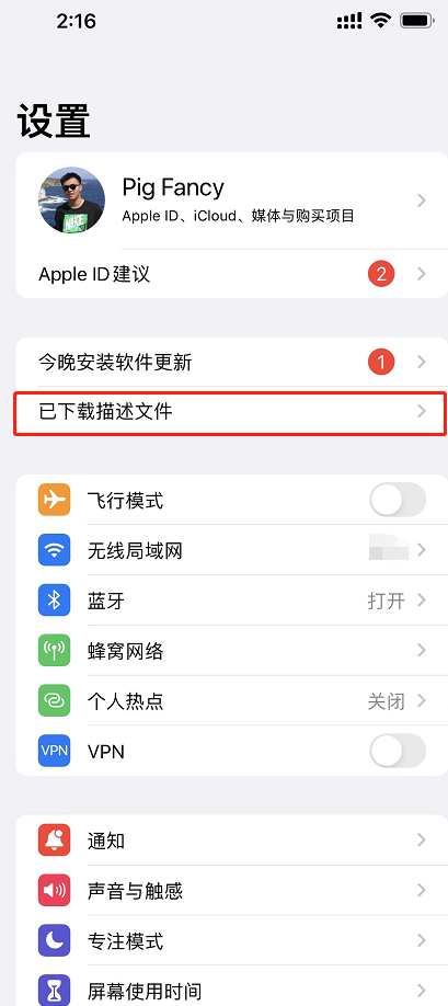 下载完成后,在主界面进入设置,选择已下载描述文件