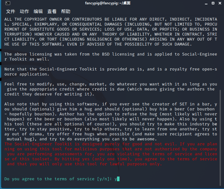 然后输入y同意条款(社会工程学工具请不要用于非法用途)