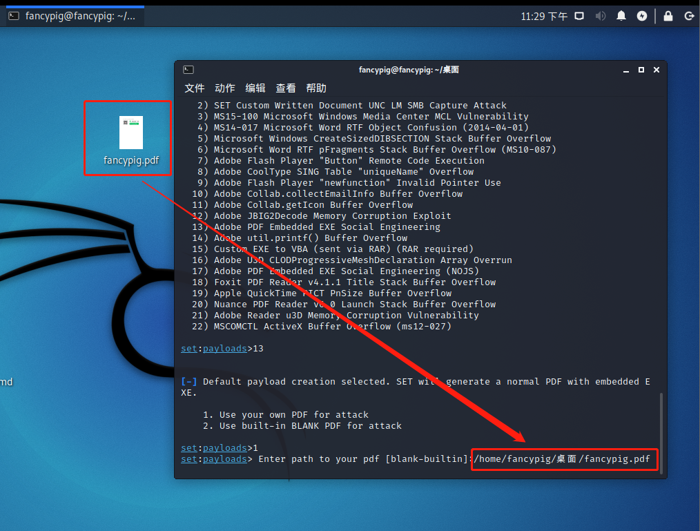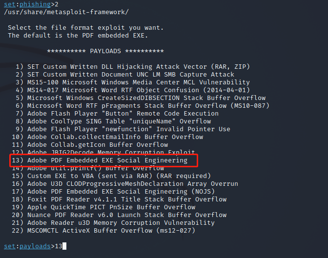然后输入13,选择Adobe PDF Embedded EXE Social Engineering