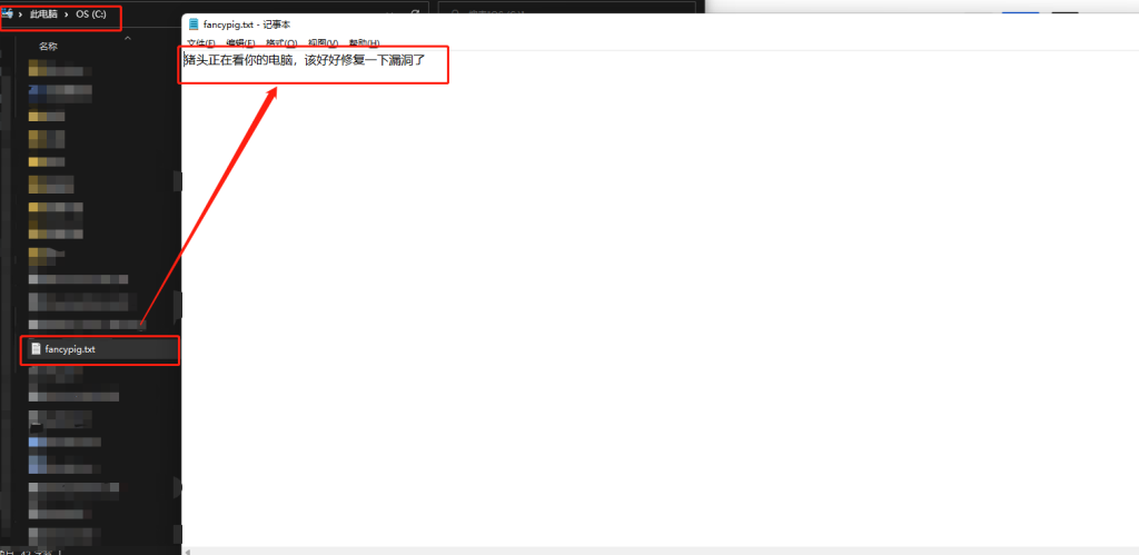 echo 猪头正在看你的电脑,该好好修复一下漏洞了>C:\fancypig.txt