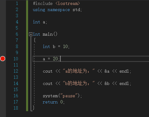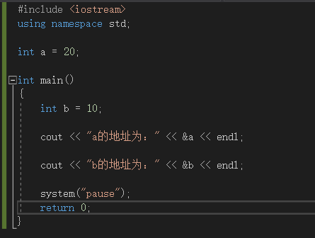 首先创建一个全局变量a,和局部变量b,并且打印它们的地址