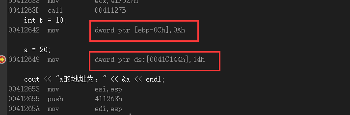 通过对比可以发现,变量b的地址是 [ebp-0Ch],变量a的地址是 [0041C144h]