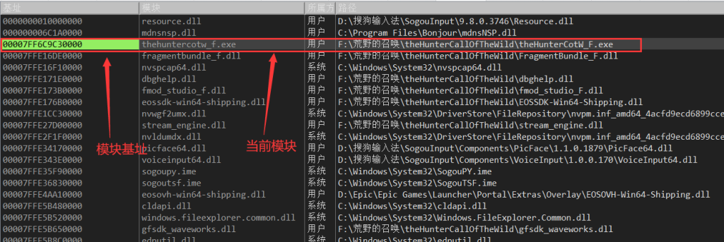 mokuai = str(ctypes.windll.LoadLibrary(r"F:\荒野的召唤\theHunterCallOfTheWild\theHunterCotW_F.exe"))#输入模块路径