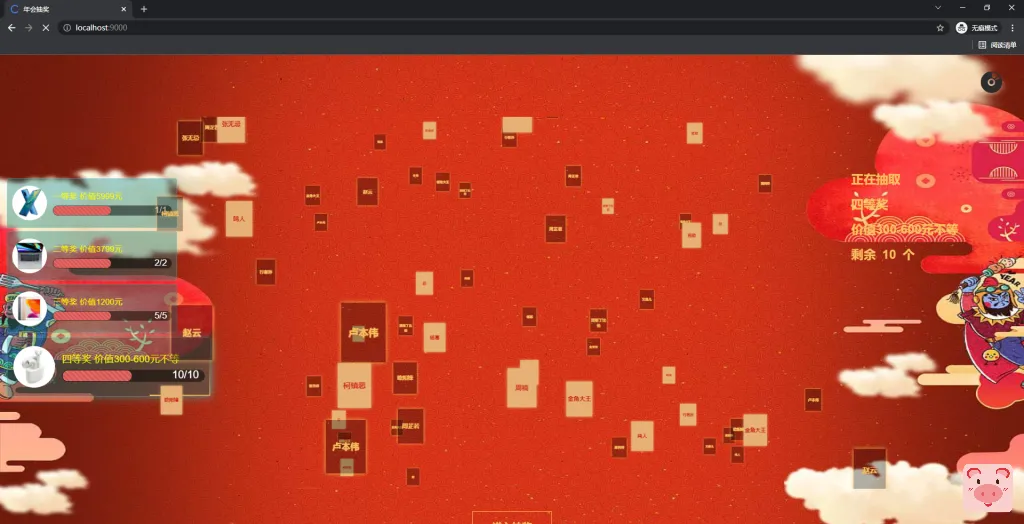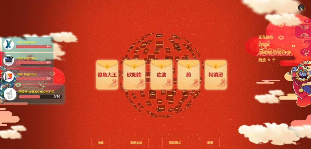 - 抽奖=>对奖池人进行当前奖品抽奖,当再次进行抽奖时会保存上次抽奖结果到缓存中并更新luckUser和leftUser