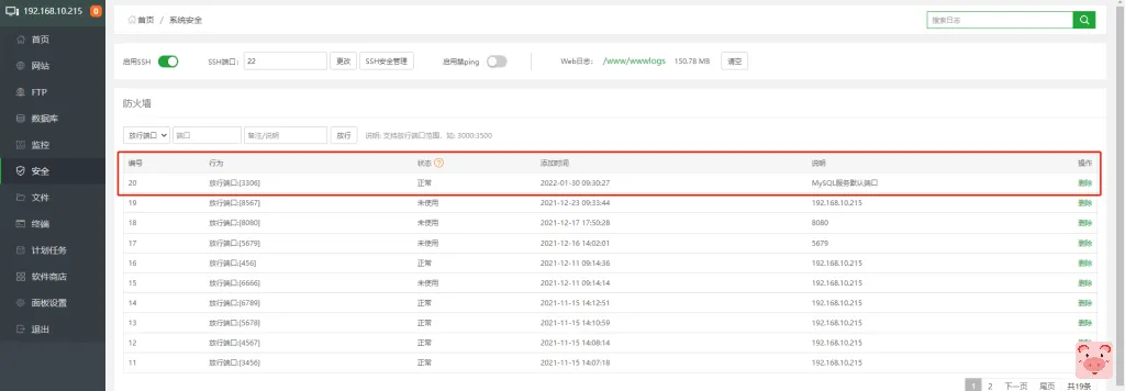 我们这里是用的宝塔面板,这里是安全中3306端口没有放行,如果你放行了依旧没有效果,还有一种可能是云服务器上的安全组端口没有放行导致的