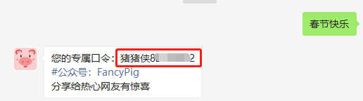 您可以通过关注FancyPig微信公众号,回复春节快乐,生成红包口令