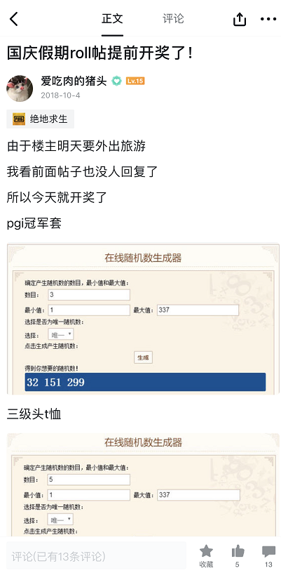 一般roll奖的人会选择使用随机数抽取的工具,然后公布幸运观众