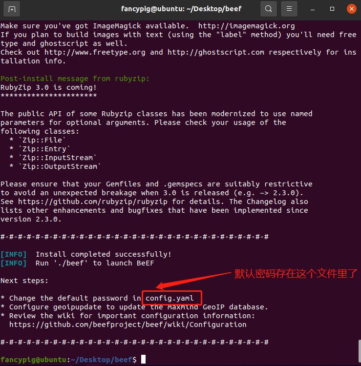 这里提示安装完成了,并且默认的密码存在了config.yaml文件里