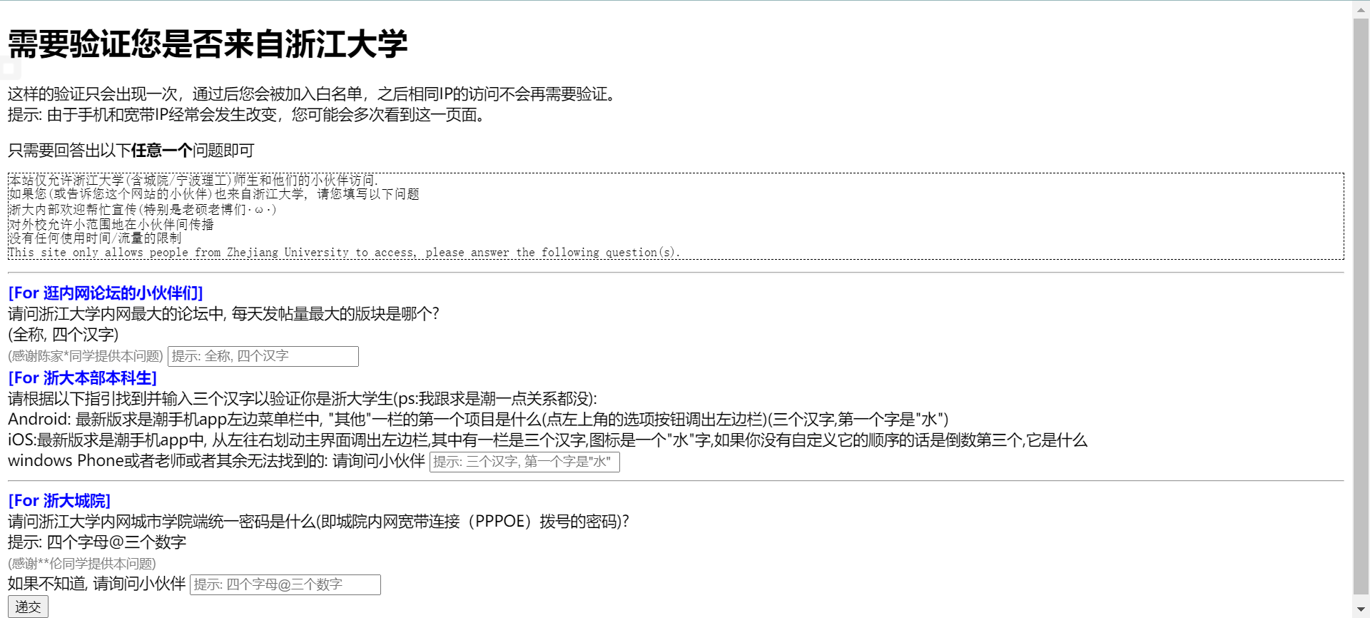 这是一个经营多年的公益性质Google镜像站点,疑似是浙江大学的,比那些三天两头就跑路的镜像站稳定的多,而且没有任何的时间/流量限制,但是有限制规则,只有回答正确的问题证明自己是该校的学生后才能使用。直接公布答案:心灵之约、水朝夕、csxy@123