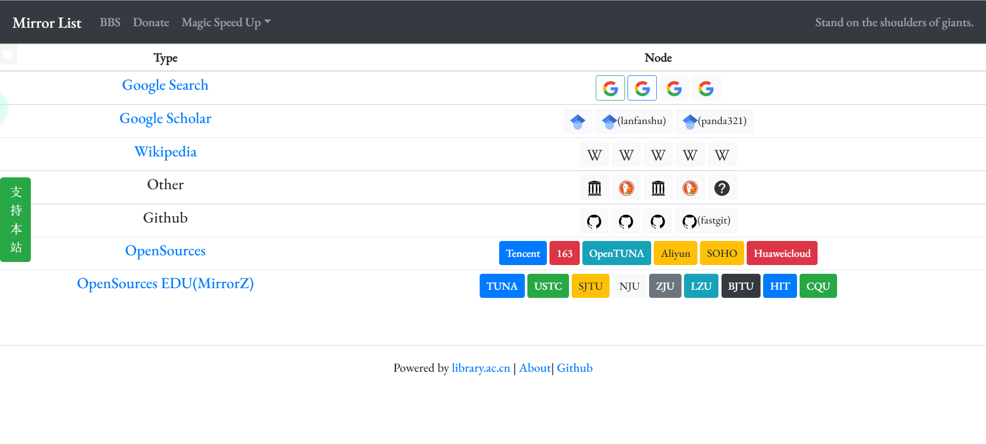 Mirror List这个网站提供了一些国内做研究的同学经常用到的服务镜像,例如google镜像和Google学术搜索镜像、维基百科、DuckDuckgo和Github等等。