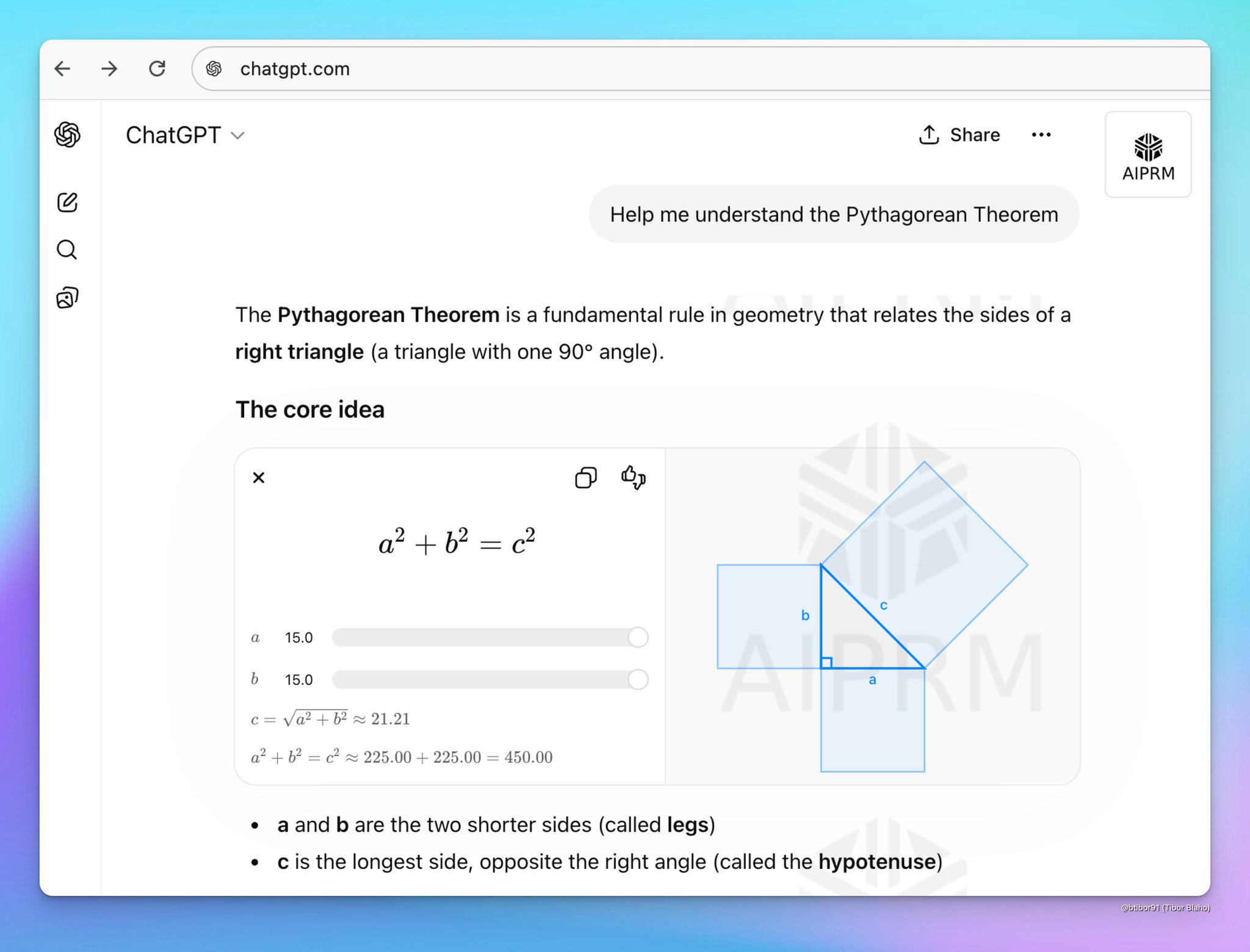 该功能上线时包含 70 多个主题,例如:勾股定理、理想气体定律、圆的面积、透镜公式等。它是在 学习模式(study mode)和测验(quizzes) 的基础上扩展的,并将向 所有已登录的 ChatGPT 用户(包括个人和企业计划) 推出。