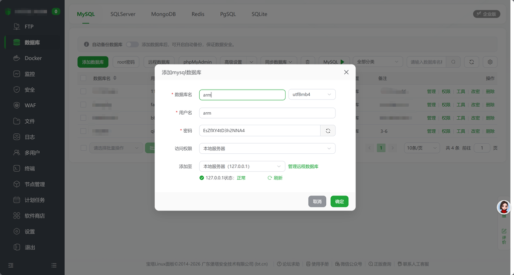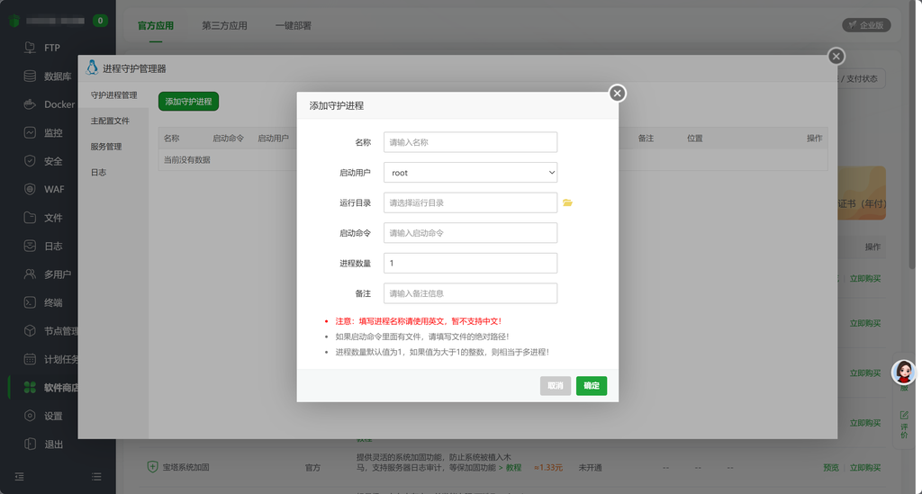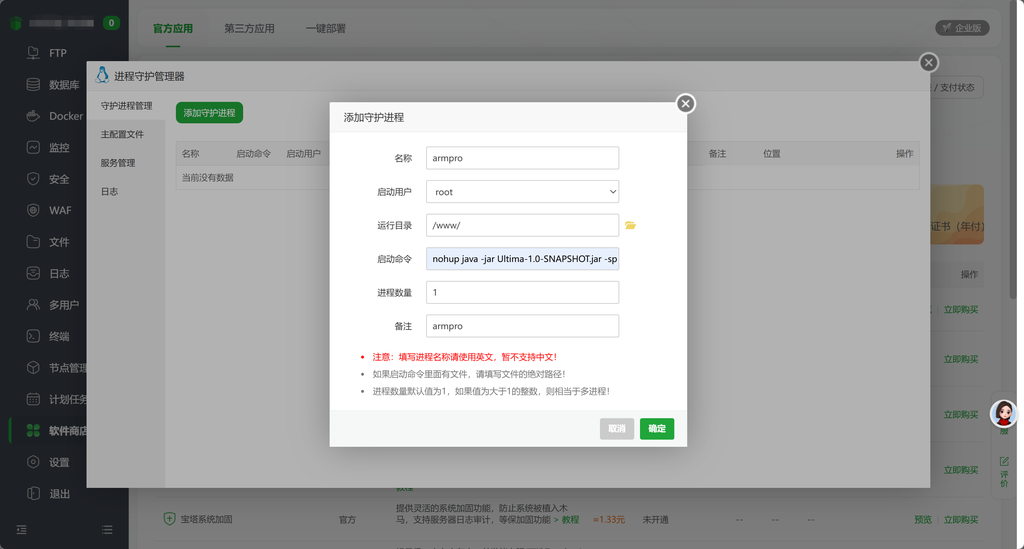 接下来打开 进程守护管理器 ,然后添加守护进程,名称随便填一个英文的,运行目录选择www,启动命令为