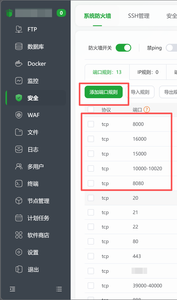 点击安全,然后点击添加端口规则,开启如图的端口,同时后期如果端口访问不通的话需要去开启自己的服务器厂商德购买地址去开端口