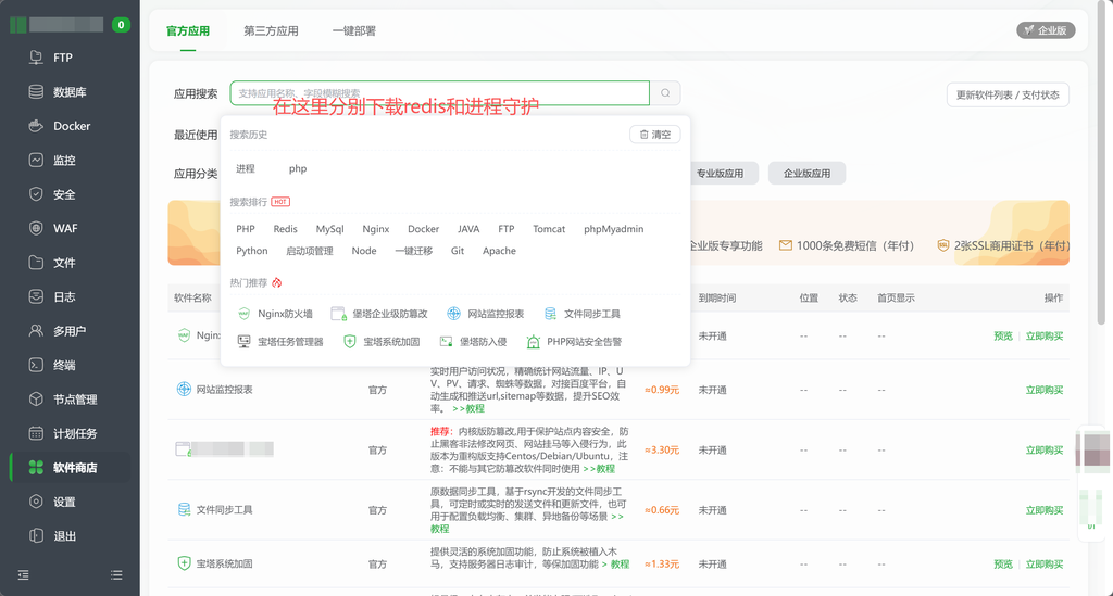 打开软件商店,分别下载redis和进程守护,当然是需要运行环境的,详细的可以看一下小白建站系列的教程