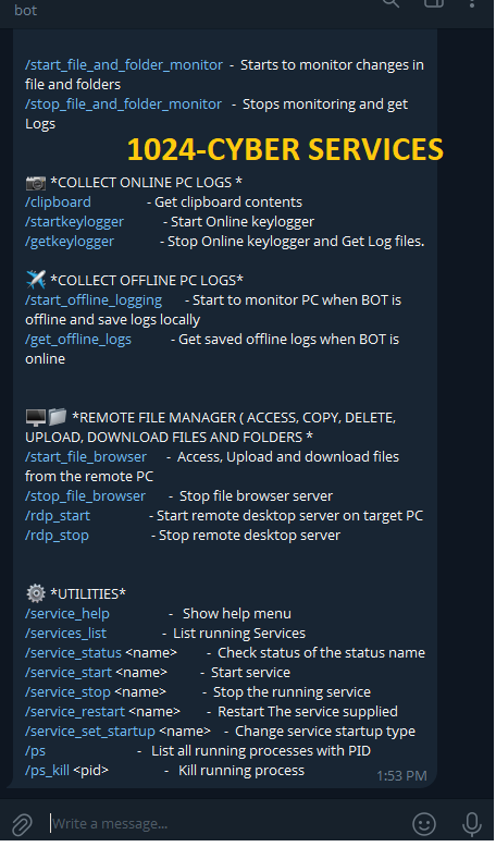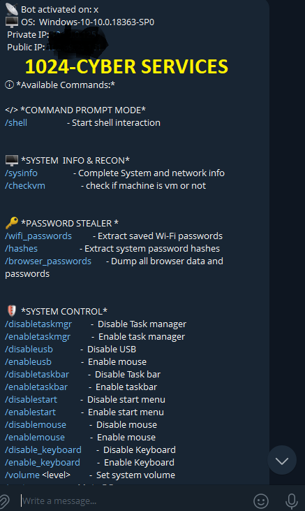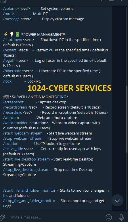 Windows-C2 Bot 是一个全面的 Telegram 控制 Windows 监控和管理实用程序,允许你通过安全的 Telegram Bot 命令与机器进行远程交互。