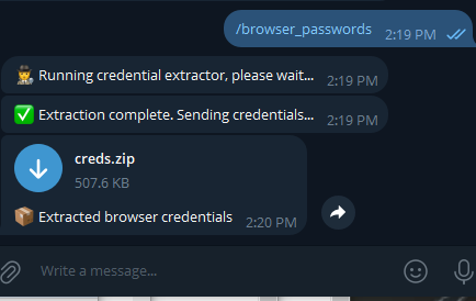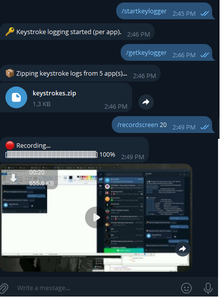 基于 Telegram Bot 的轻量级 Windows 远程控制框架,支持凭据窃取、实时监控、文件管理等 C2 功能。