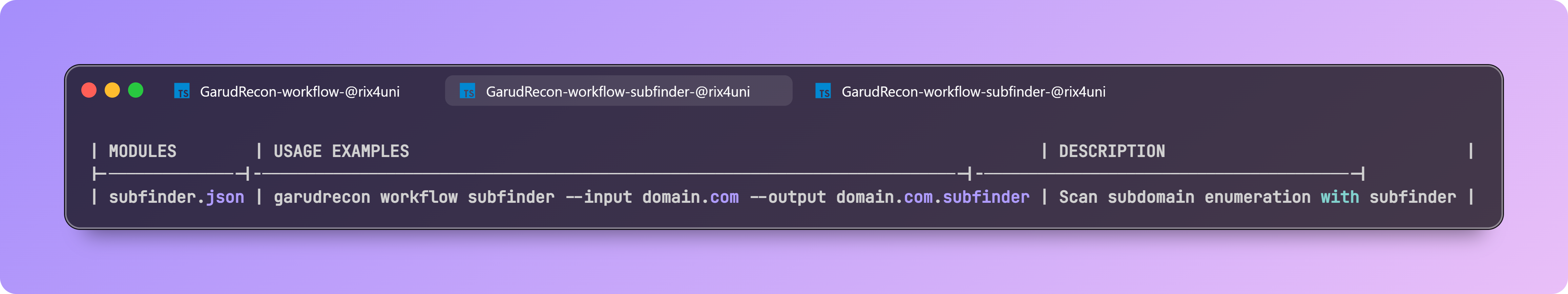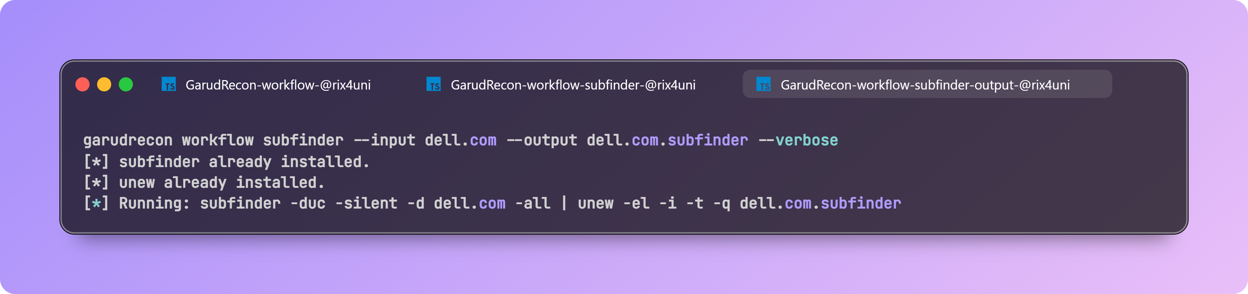 ``` Chain multiple tools into a reusable pipeline so you can run complex scans with a single command. Compose small steps (mapcidr → httpx → nuclei …) into one workflow file and execute it without manually installing or running each tool. Usage: garudrecon workflow [flags] Flags: -i, --input Pass the input -o, --output Location where you want to save output -v, --verbose enable verbose mode -h, --help help for workflows Example: garudrecon workflow amass --input