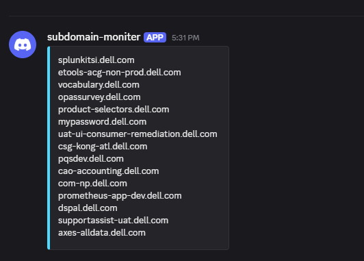``` Schedule and monitor recurring recon tasks (subdomains, open ports, JS leaks, templates, alerts). Run continuous monitoring: periodic scans, delta detection, and notifications when new assets or issues appear. Usage: garudrecon cronjobs [flags] Flags: -d, --domain Domain to monitor -f, --function Function to run (e.g. MONITOR_SUBDOMAIN) -c, --config Custom configuration file path -i, --interval Customize the sleep duration (e.g. 1800) -v, --verbose enable verbose mode -h, --help help for cronjobs Example: garudrecon cronjobs -d domain.com -f MONITOR_SUBDOMAIN garudrecon cronjobs -d domain.com -f MONITOR_PORTS garudrecon cronjobs -d domain.com -f MONITOR_ALIVESUBD garudrecon cronjobs -d domain.com -f MONITOR_JS garudrecon cronjobs -d domain.com -f MONITOR_JSLEAKS ``` #### 输出