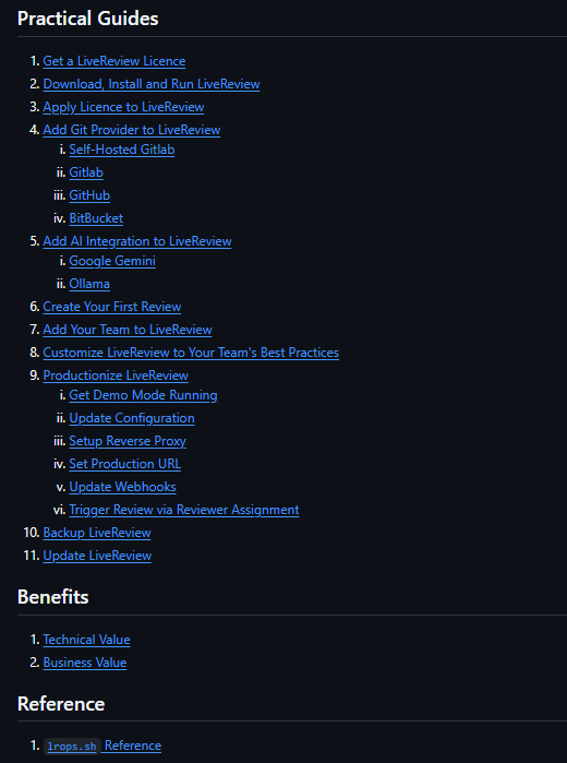 ## 快速入门 —— 自托管社区版(免费) 在 5 分钟内运行起 LiveReview。**社区版完全免费**,包含开启 AI 驱动的代码审查所需的一切。 ### 一键安装 ``` # 快速演示设置(仅 localhost,无 webhooks) curl -fsSL https://raw.githubusercontent.com/HexmosTech/LiveReview/main/lrops.sh | sudo bash -s -- setup-demo ``` **环境要求:** - `bash` shell(非官方支持 zsh/fish) - Ubuntu/MacOS - Docker(需包含 `docker-compose` 或 `docker compose`) - `jq` 您需要获取一个 **免费许可证** 才能开始 —— 请遵循此处的指南 [here](https://github.com/HexmosTech/LiveReview/wiki/Get-a-LiveReview-Licence)。 **访问您的安装:** - Web UI: http://localhost:8081/ - API: http://localhost:8888/api ### 免费版包含的内容(社区版) - ✅ **完整的 AI 代码审查** —— 与付费版相同且强大的 AI 审查引擎 - ✅ **所有 Git 提供商** —— 集成 GitHub, GitLab, Bitbucket, Gitea - ✅ **任意 AI 提供商** —— Gemini, OpenAI, 或自托管 Ollama - ✅ **仪表盘与分析** —— 追踪审查质量和团队速率 - ✅ **最多 3 位用户** —— 完美适配小团队或个人开发者 - ✅ **无限次审查** —— 无每日限制,按需审查 ### 生产环境部署 对于需要外部访问和 webhooks 的团队,请遵循 [生产化部署指南](https://github.com/HexmosTech/LiveReview/wiki/Productionize-LiveReview)。 | 功能 | 演示模式 | 生产模式 | |---------|-----------|-----------------| | **访问方式** | 仅限 localhost | 通过反向代理进行外部访问 | | **Webhooks** | 禁用(手动触发) | 启用(自动触发) | | **配置** | 零配置 | 需设置反向代理 | | **适用场景** | 开发、测试、演示 | 团队、生产部署 | ## 为何选择 LiveReview | | | |---|---| | **Git 级别的防护栏** | 未读代码绝无蒙混过关可能。审查追踪每一次提交,故意的跳过行为也会保留在审计记录中。 | | **兼容您的 Git 设置** | GitHub, GitLab, Bitbucket, Gitea 或其他——LiveReview 适应您的工作流,而非相反。 | | **选择您的 AI** | 选择符合当下质量、延迟和预算要求的 LLM,并在需求变更时随时替换。 | | **随处可用** | Web, CLI, IDE。云端、自托管或物理隔离环境。处处皆有相同的防护与可见性。 | | **定价旨在不构成阻碍** | 审查的成本不应决定是否进行审查。LiveReview 保持轻量,以便团队能每日使用。 | | **必要时提供足够深度** | 逐行审查、真实的 MR 对话,以及持久的团队知识沉淀——且没有常见的工具臃肿问题。 | ### 为什么工程团队喜爱 LiveReview - **加速交付周期** —— 将 PR 审查时间从数小时缩短至数分钟,让您的团队更快、更自信地交付功能 - **节省资深工程师时间** —— 将资深开发者从常规审查中解放出来,使其专注于指导和高影响力的架构工作 - **推动卓越质量** —— 建立质量文化,用指标展示代码标准的改进、缺陷的减少和开发效率的提升 ## 面向现代工程团队的强大功能