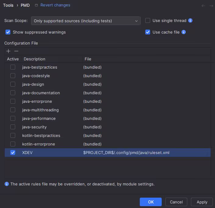 * 如果存在项目配置文件(`.idea/pmd-x.xml`),则会自动完成配置