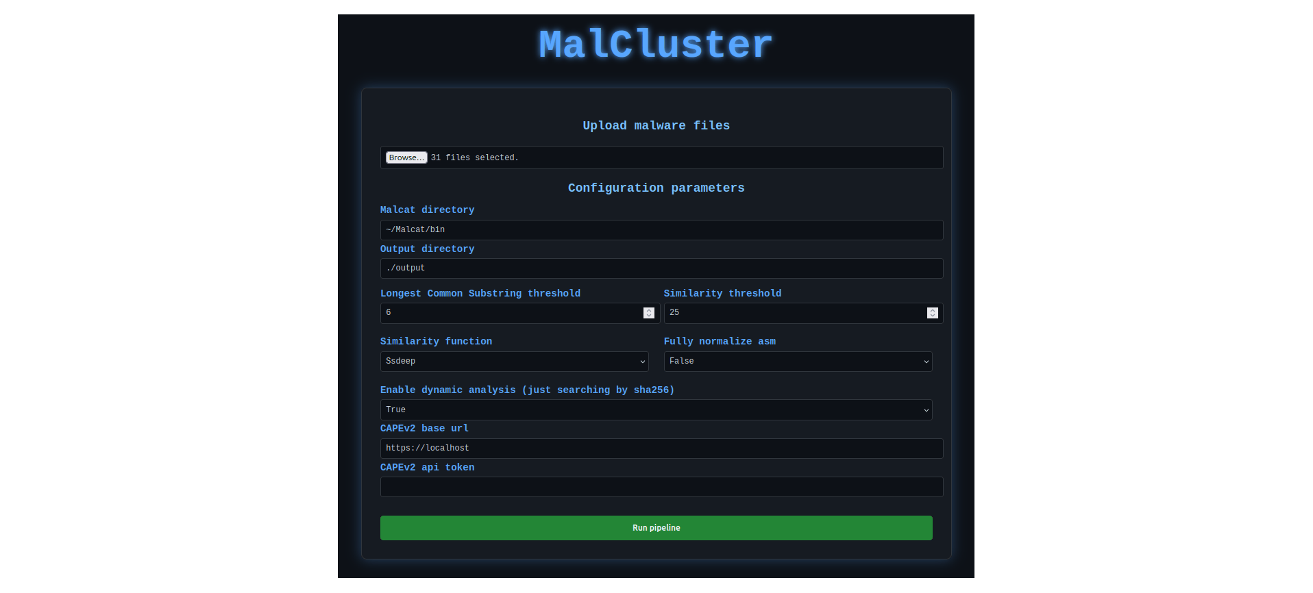 **MalCluster** 是一个使用 **Malcat** 和 **CAPEv2** 从恶意软件样本中提取静态和动态分析产物的 pipeline,并提供基于 **Flask 的 Web GUI** 以供交互使用。