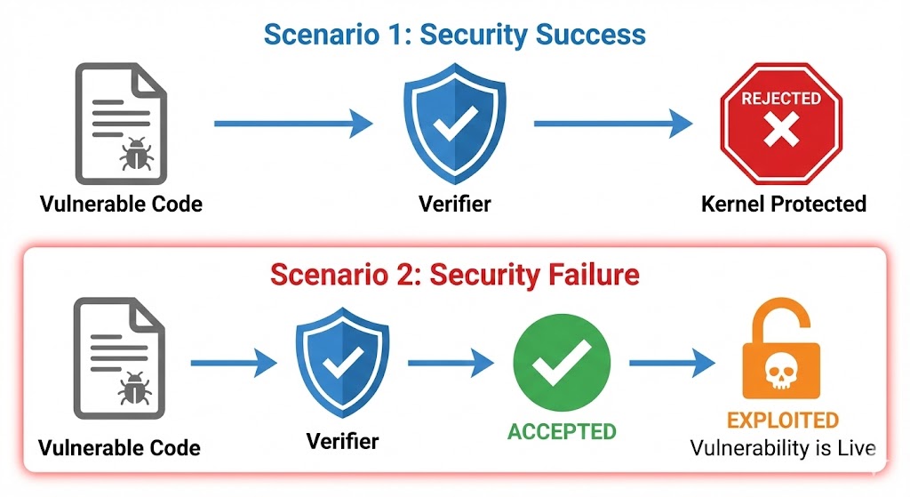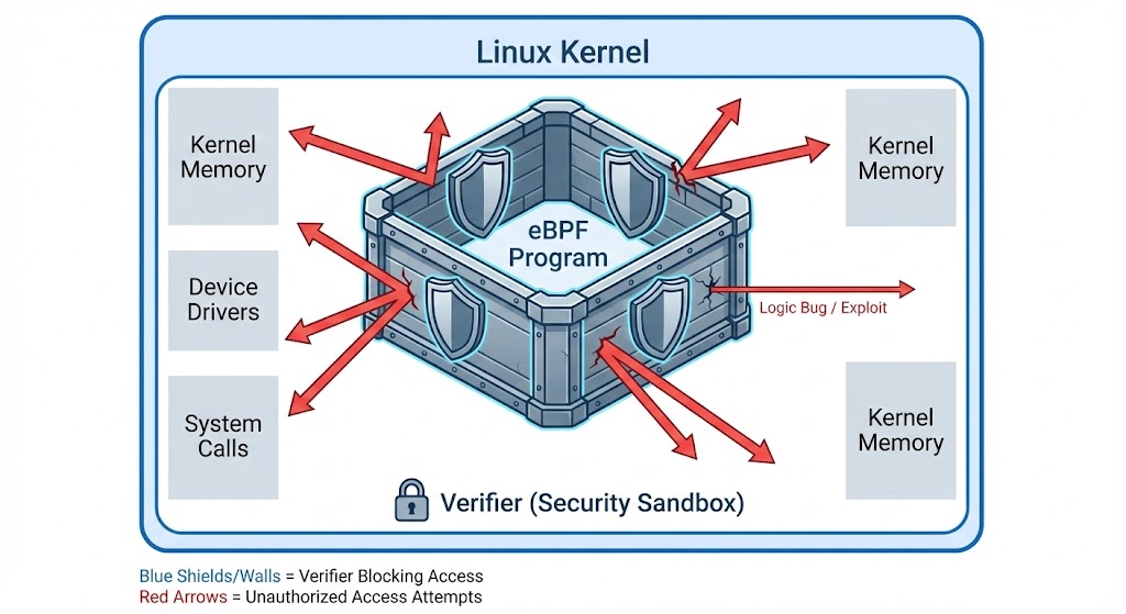 本项目探讨了 **eBPF (extended Berkeley Packet Filter)** 的安全边界,这是一项革命性的技术,允许用户定义的程序在 Linux 内核中安全运行。虽然 eBPF 的验证器旨在保证内存安全并防止恶意代码执行,但某些逻辑错误可能绕过这些保护。
