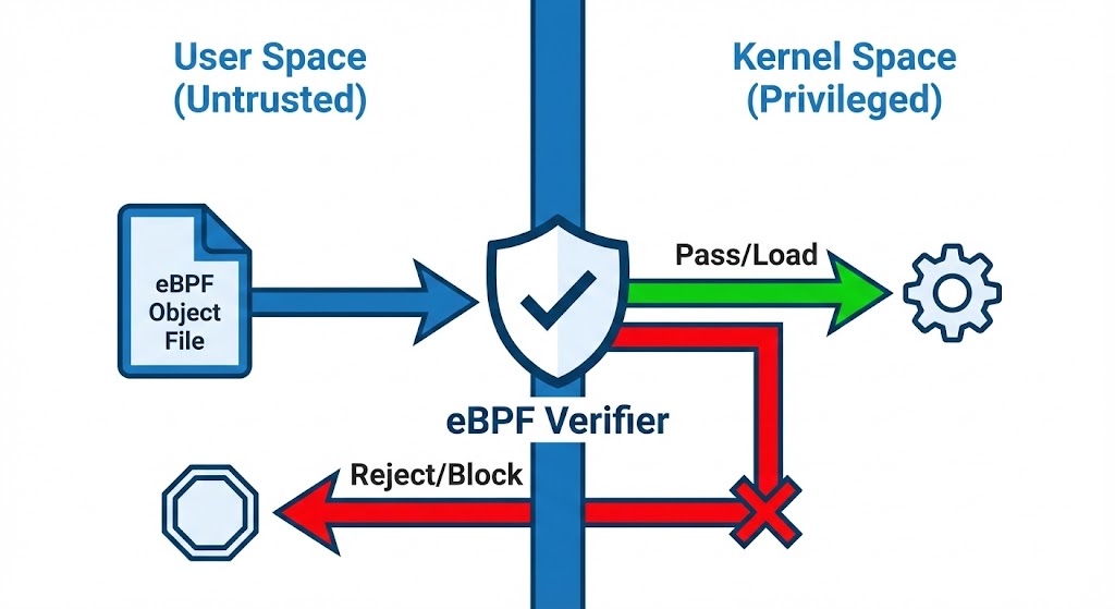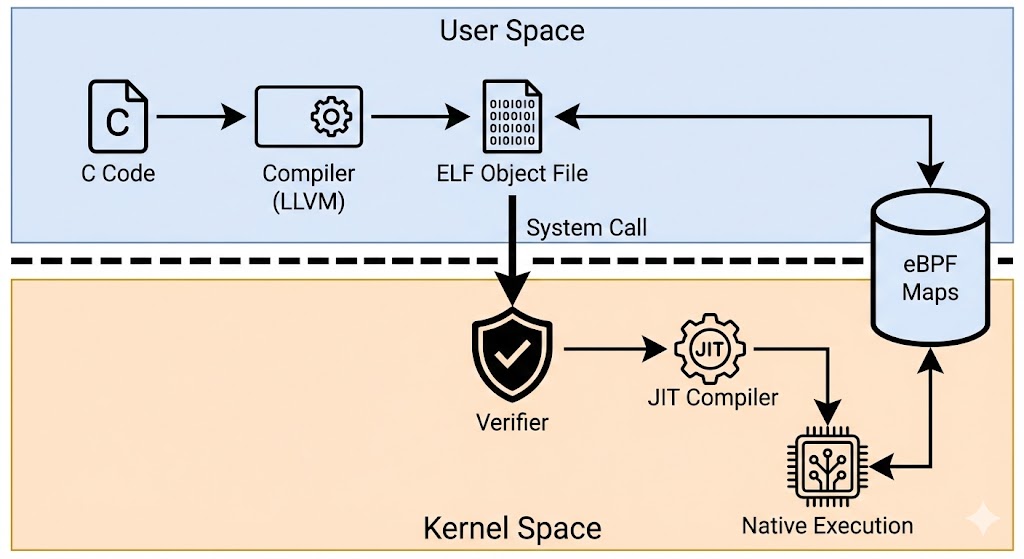 3. 使用用户空间加载器**加载 eBPF 程序**(验证器自动检查)。