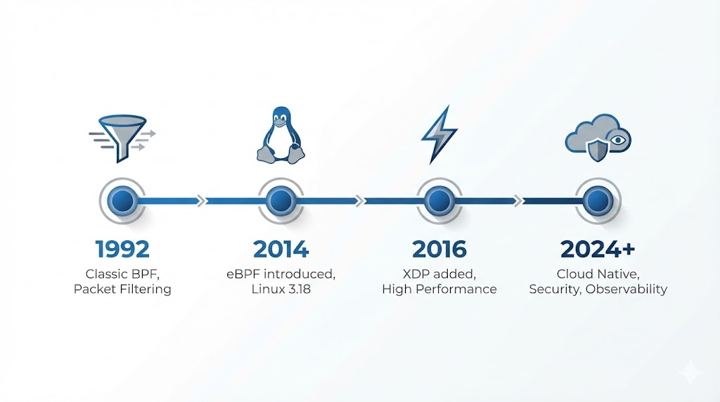 ### 起源与演变 **eBPF (extended Berkeley Packet Filter)** 是一项革命性的技术,起源于 1992 年创建的经典 BPF (Berkeley Packet Filter),最初用于网络数据包过滤。虽然经典 BPF 仅限于简单的数据包检查(被 `tcpdump` 等工具使用),但 eBPF 已演变成一个通用的**内核内虚拟机**,能够在 Linux 内核中运行沙盒程序。
