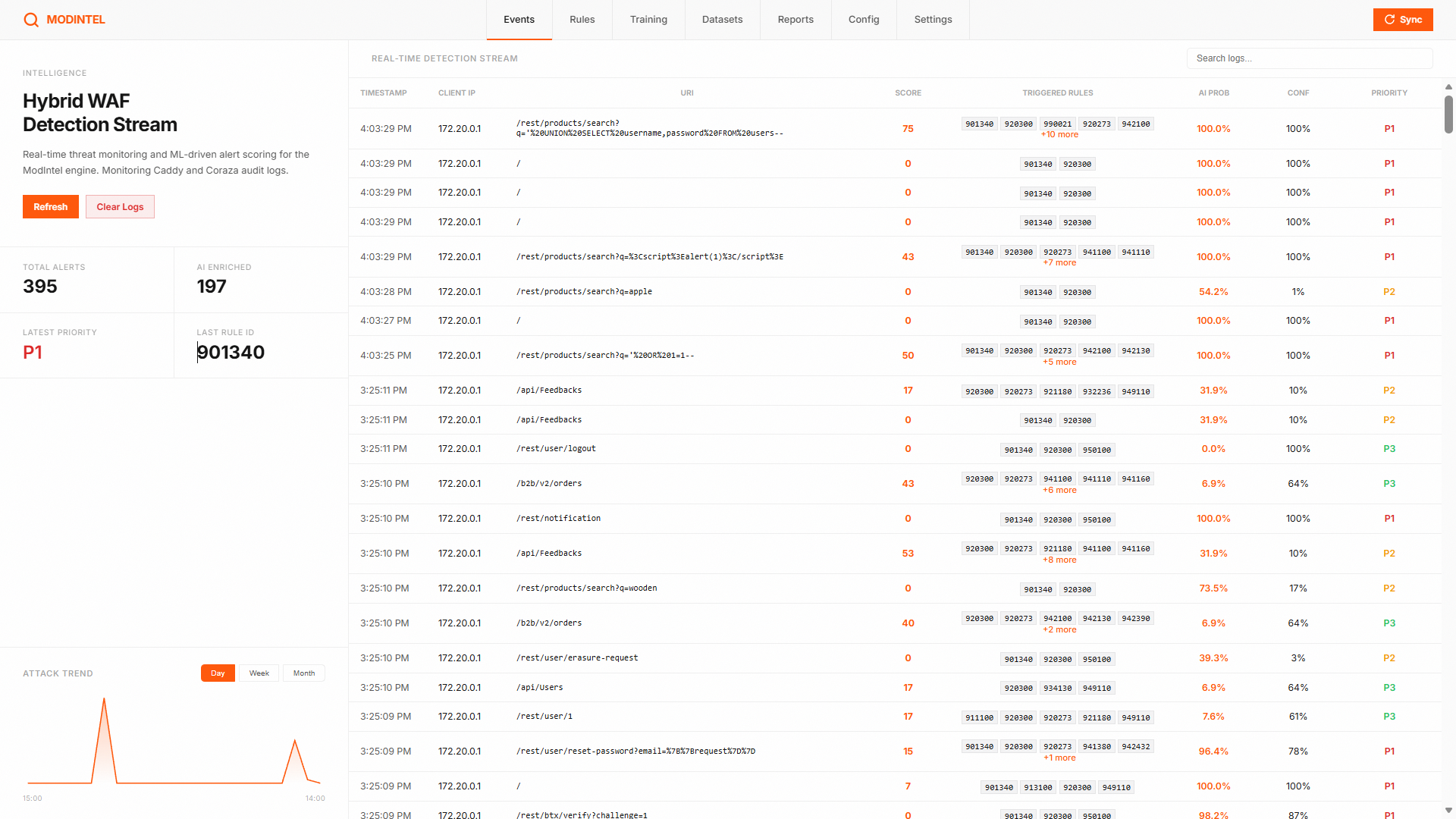 一个结合机器学习与规则引擎的混合 WAF 研究系统,旨在降低误报并提供实时分析仪表板。