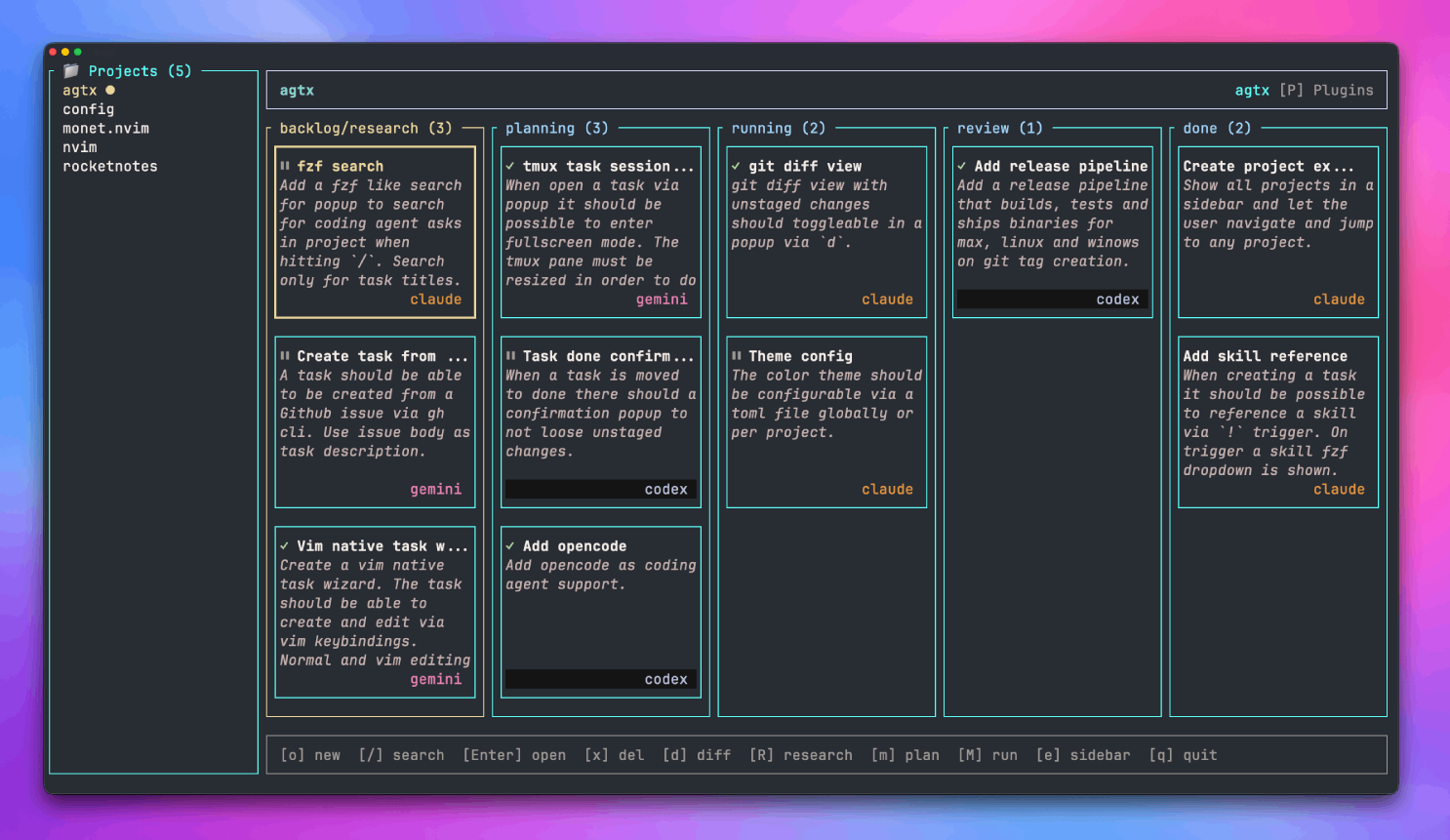 - **Tmux**:名为 `agtx` 的专用服务器,包含按项目划分的会话