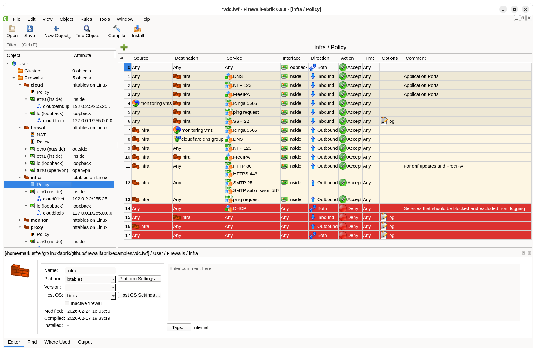 现代版 fwbuilder 继任者,通过 Qt GUI 集中管理 iptables/nftables 防火墙策略,支持大规模部署和规则复用。