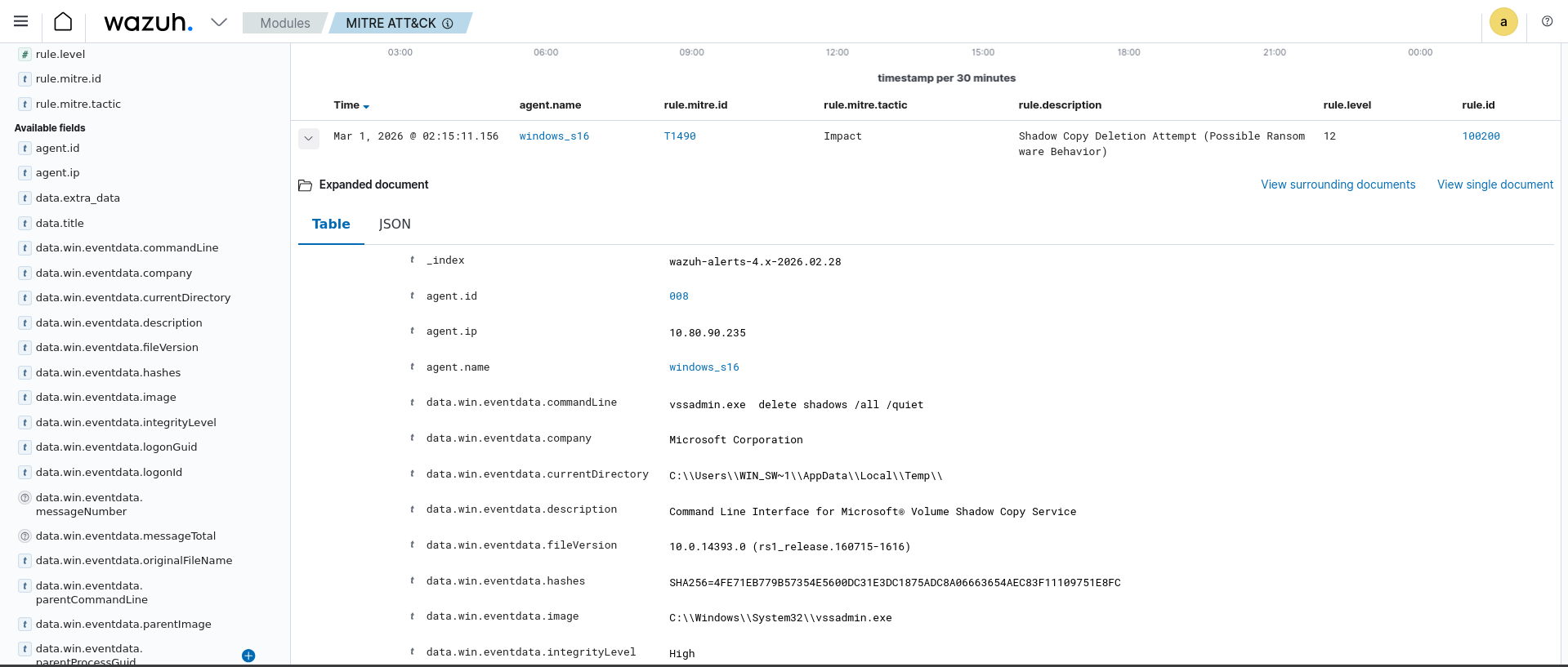 警报在 Wazuh Dashboard 中成功生成,并正确映射到 MITRE ATT&CK Impact 战术 (T1490)。