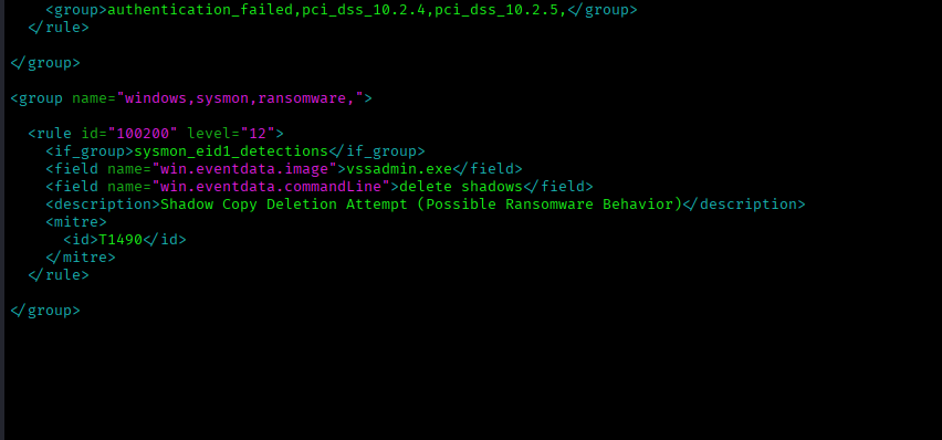 默认的 Wazuh 规则不包含针对与 T1490 技术相关的 vssadmin delete shadows 命令的特定检测规则。