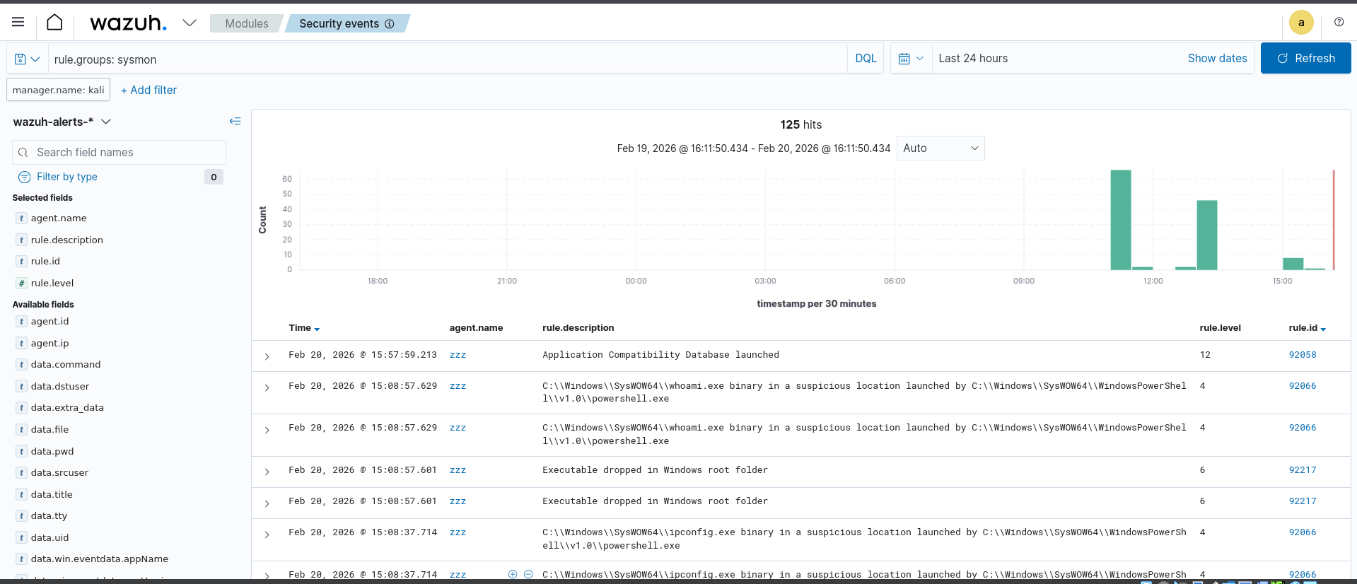 执行 T1490 (卷影副本删除) 攻击模拟后,警报最初未出现在 Wazuh Dashboard 中。