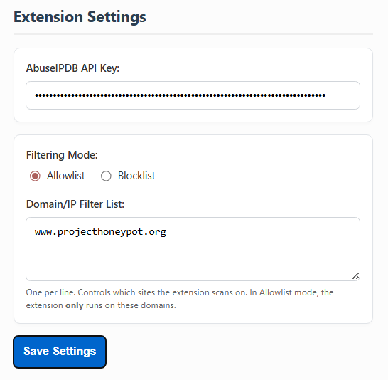 5. 打开扩展的 **选项页面** 并输入你的 [AbuseIPDB API 密钥](https://www.abuseipdb.com/account/api)