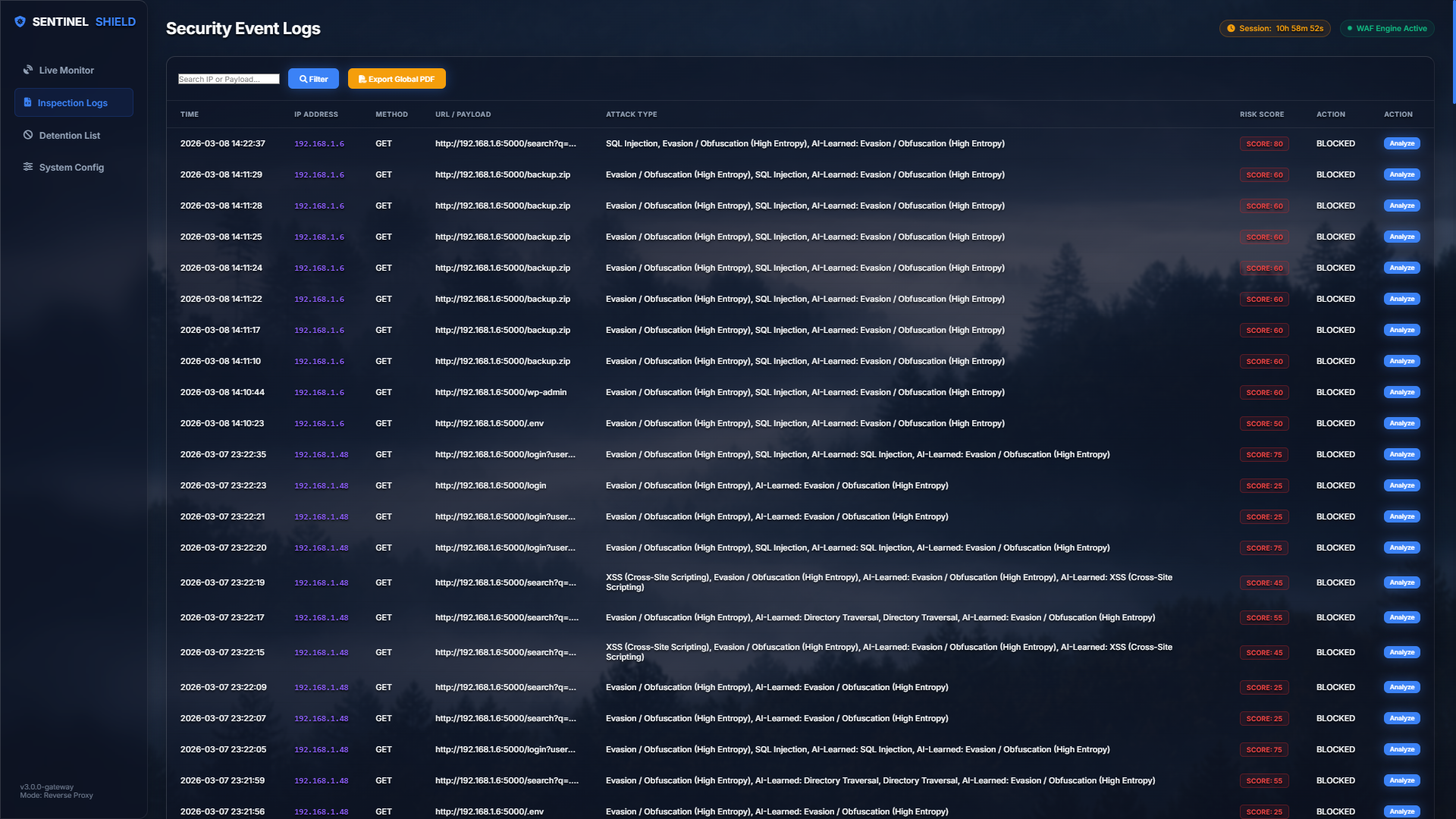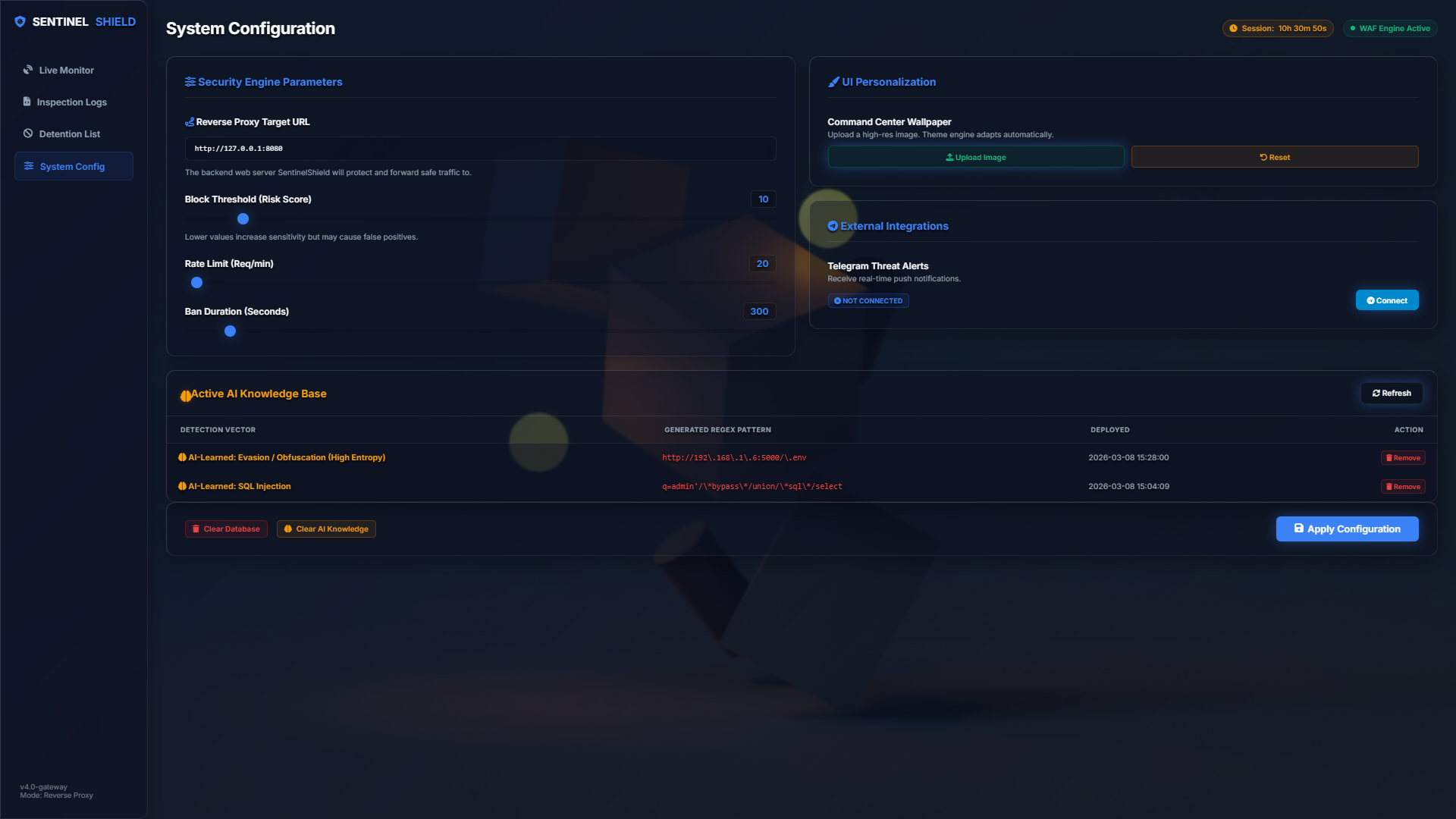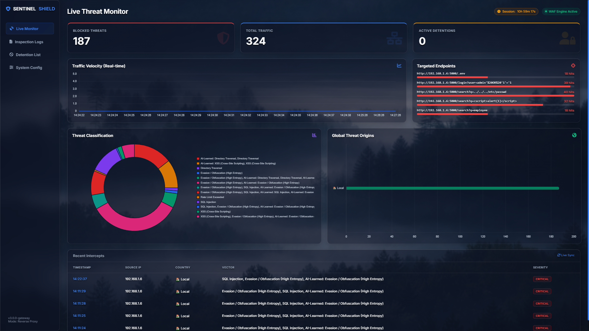 SentinelShield 是一款基于机器学习的下一代 Web 应用防火墙与安全运营中心,通过反向代理机制拦截并智能检测流量威胁。